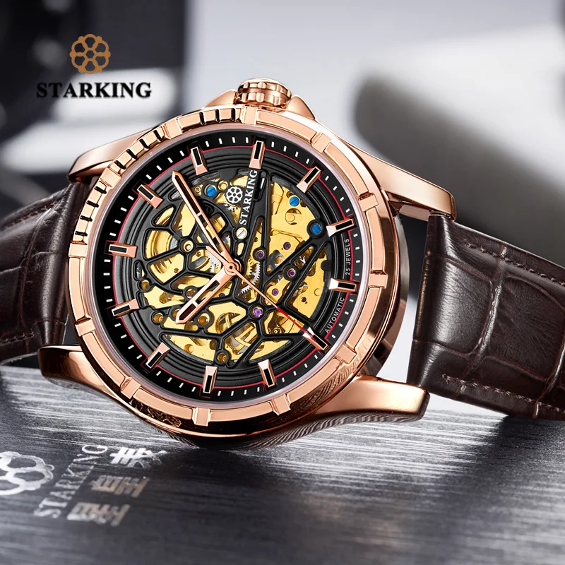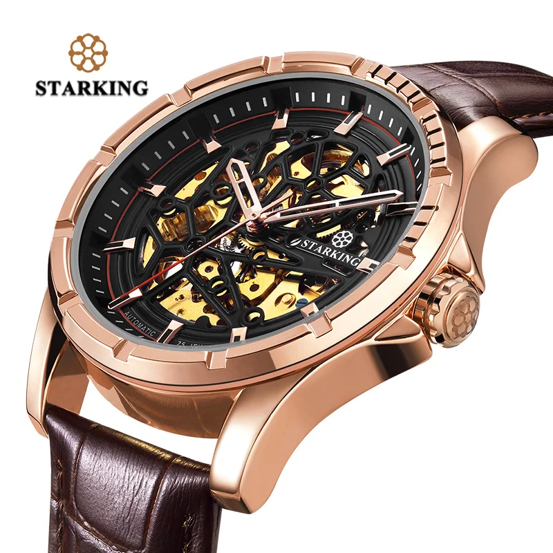 STARKING Mens Transparent Watches 28800 High-Beats Movement Wristwatches Male Clock Leather Relogio
